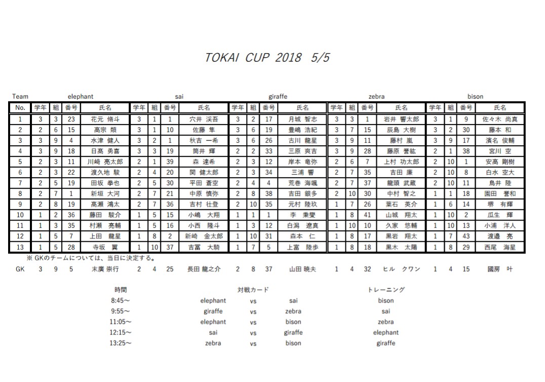 その他5月5日(土)TOKAI CUP投稿者: tokaifukuoka、 2018年5月4日2018年5月4日 5月5日(土)に行われるTOKAI CUPについてチームを発表いたしますのでご確認ください。