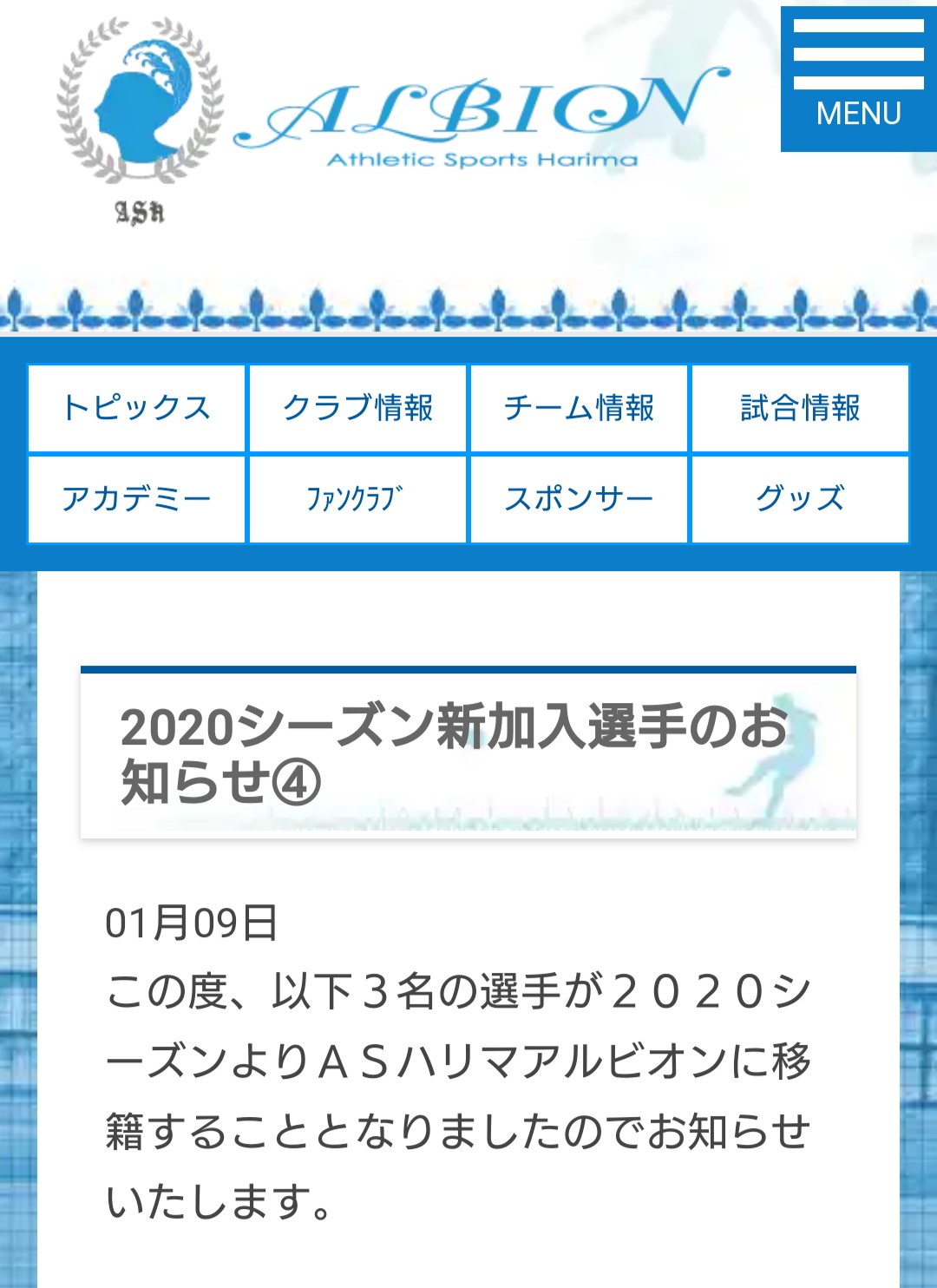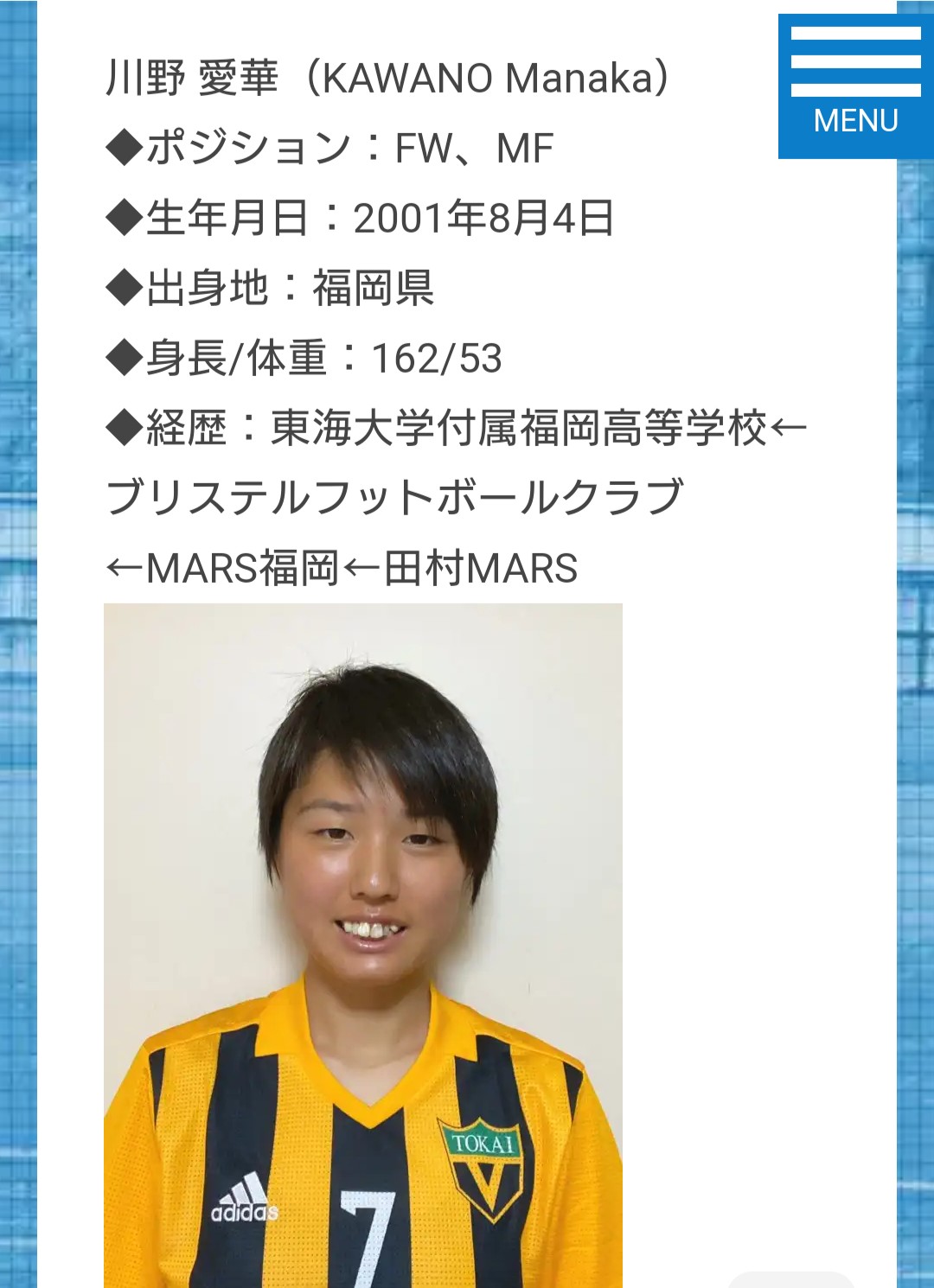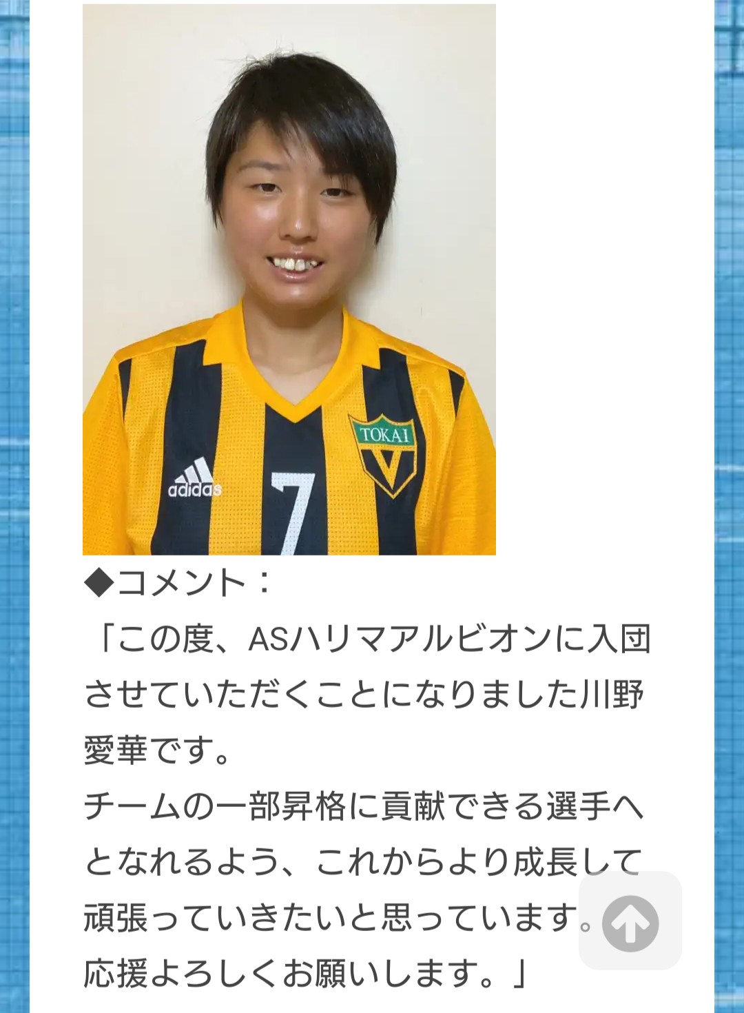 女子サッカー川野愛華選手 ASハリマアルビオン入団決定のご連絡投稿者: tokaifukuoka、 2020年1月16日2020年1月16日 本校3年生の川野愛華さんがASハリマアルビオン(なでしこリーグ2部)に入団が決定しましたので、ご連絡致します。 ますますの活躍を期待しております! 2020シーズン新加入選手のお知らせ④