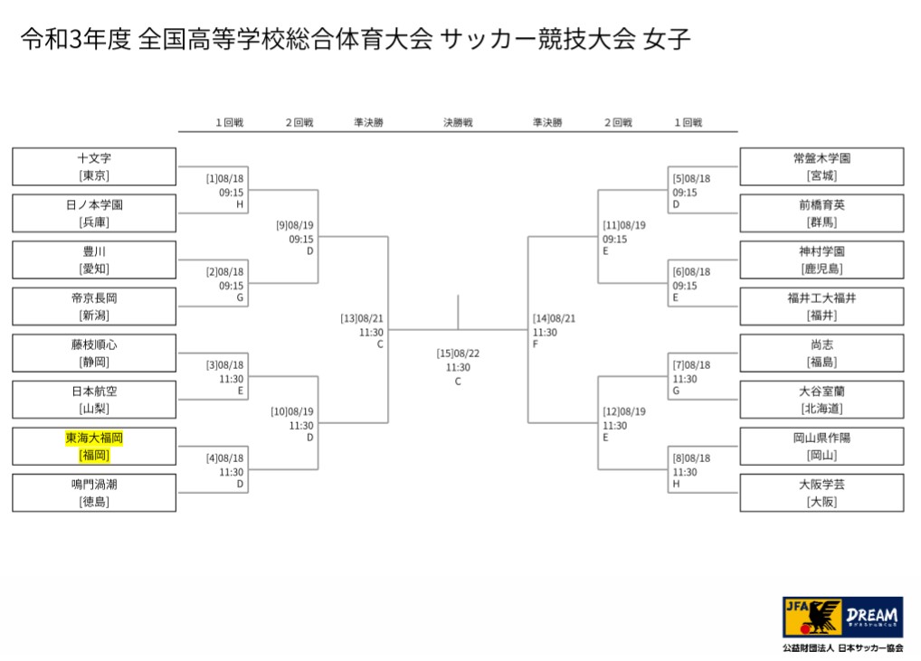 女子サッカー令和3年度全国高等学校総合体育大会サッカー競技大会 女子投稿者: tokaifukuoka、 2021年8月15日2021年8月15日 8月18日(水)から福井県において、『令和3年度全国高等学校総合体育大会サッカー競技大会 女子』が開催されます。 日本一を目指して、1戦1戦全力で戦います。 応援よろしくお願い致します。